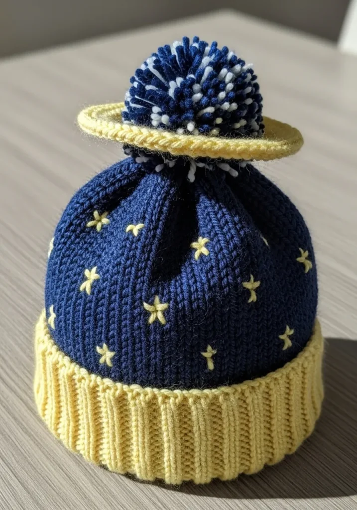 This charming beanie is knitted in a deep navy blue yarn with a soft golden yellow brim that folds up neatly for extra warmth. Tiny embroidered star details are scattered across the body, giving it a dreamy night sky vibe, and a fluffy pom pom on top adds the perfect finishing touch. The ribbed brim provides structure and stretch, while the rest of the hat keeps a smooth, even texture that highlights the contrast colors beautifully. It feels cozy, whimsical, and just structured enough to look store bought in the best way.