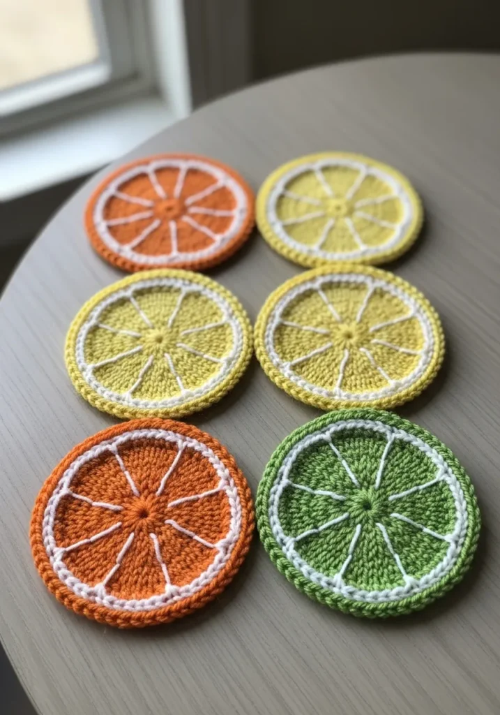These cheerful coasters are knitted in vibrant shades of orange, lemon yellow, and fresh lime green, each one designed to mimic a juicy slice of citrus. The circular shape is created with simple increases, while contrasting white yarn forms the little segment lines that make each slice look realistic. The texture is soft yet sturdy enough to hold a mug, and the bold colors instantly brighten up any coffee table. Lined up together, they look like a tiny fruit platter made entirely of yarn.