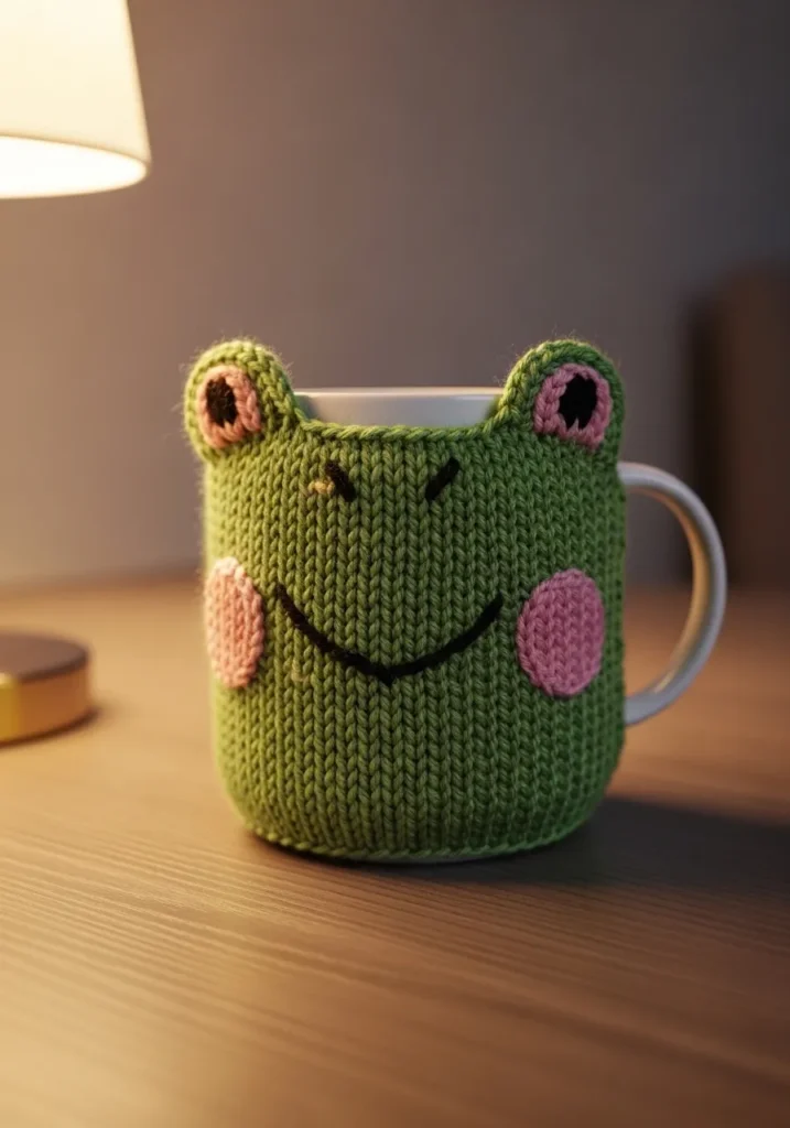 This delightful mug cozy is knitted in a soft leafy green yarn with pink blush cheeks and tiny black stitched eyes that give it an irresistibly sweet frog face. The cozy wraps snugly around a standard mug, with a simple button or snug seam at the back to hold it in place. The knit texture is smooth and even, allowing the little facial details to stand out, while the gentle stretch keeps your drink insulated and your hands protected from heat. It feels playful, cozy, and perfect for a quiet tea moment.
