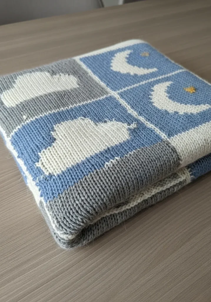 This cozy baby blanket features knitted squares in gentle shades of sky blue, soft gray, and creamy white, each panel showcasing simple cloud and moon motifs. The design is built from neat, evenly sized blocks stitched together to create a tidy patchwork effect. The yarn looks plush and comforting, with a smooth texture that feels perfect for sensitive skin. The contrast between the pale sky background and the white cloud shapes gives it a calm, dreamy vibe that feels both sweet and timeless.