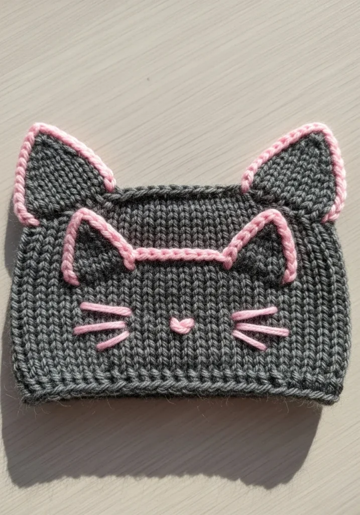 This playful headband is knitted in a soft charcoal gray yarn with delicate pink accents outlining the little cat ears and facial details. The base is a simple ribbed or garter stitch band that stretches comfortably around the head, while the ears are shaped with easy increases and decreases. Embroidered whiskers and a tiny nose add personality without making the project complicated. The texture looks cozy and structured, giving it just enough firmness to hold its shape.