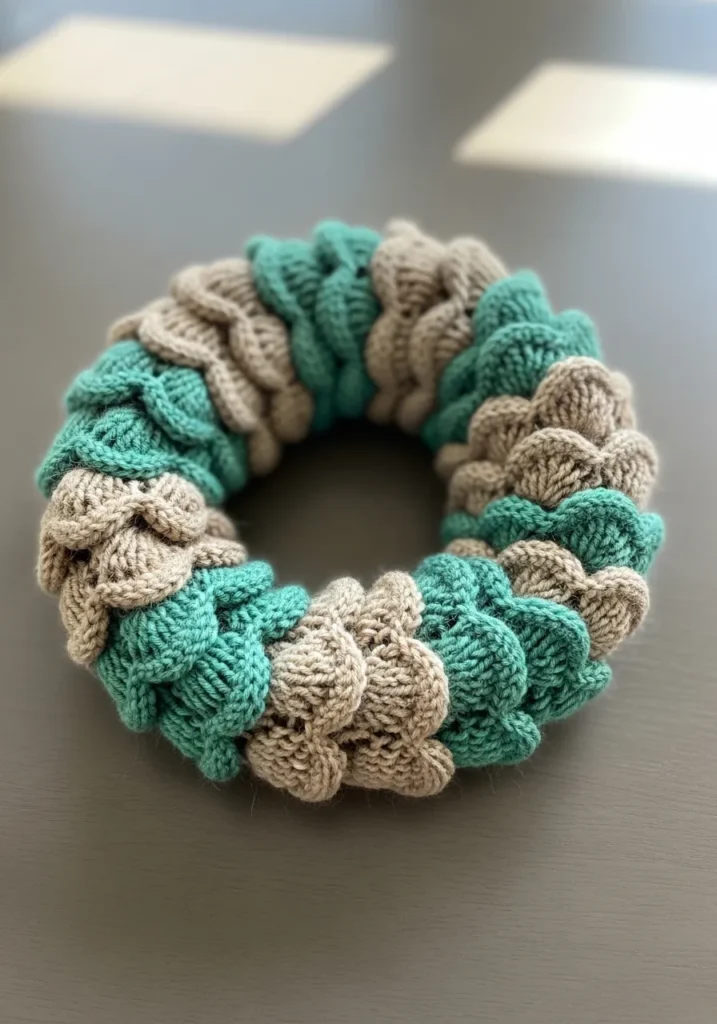 This cozy knitted scrunchie is made with thick, plush yarn in soft mint green and warm beige tones, creating a beautiful twisted texture all the way around. The stitches look slightly oversized and bouncy, giving it that fluffy, cloud like feel that instantly makes you want to touch it. The alternating colors add depth and charm, while the gathered design keeps it stretchy and practical for everyday wear.