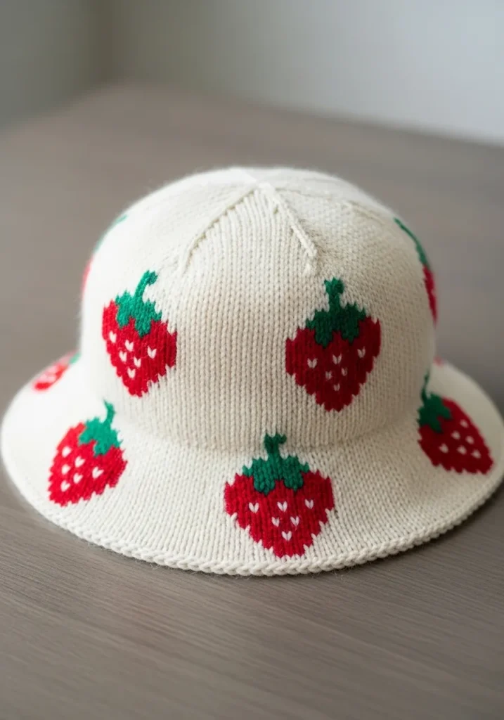 This playful knitted bucket hat is worked in soft cream yarn and scattered with bright red strawberry motifs and tiny green leaves. The smooth stockinette base lets the colorful fruit pattern pop, while the gently flared brim gives it that trendy street style silhouette. The stitches look neat and even, creating a polished finish that feels both youthful and fashion forward.