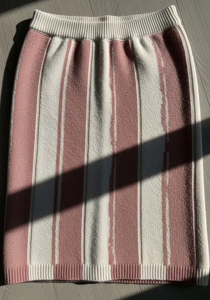 This modern knitted skirt features vertical stripes in muted tones like dusty rose, cream, and soft taupe. The ribbed waistband provides structure, while the smooth knit fabric drapes comfortably along the body. The clean stripe layout elongates the silhouette and keeps the design fresh and fashion forward.