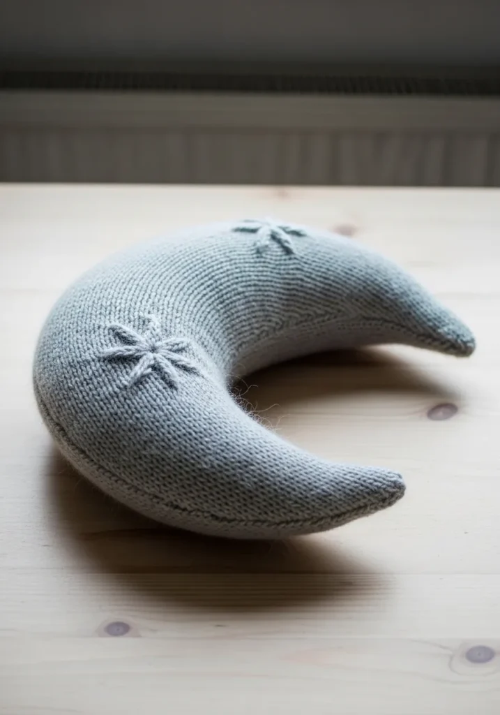 This soft crescent shaped knitted pillow is worked in a pale gray yarn with subtle stitched star details on the surface. The smooth knit texture and gentle curve create a calming, sculptural feel that fits beautifully into a modern bedroom or reading nook. Its understated color keeps it versatile while the unique shape adds visual interest.