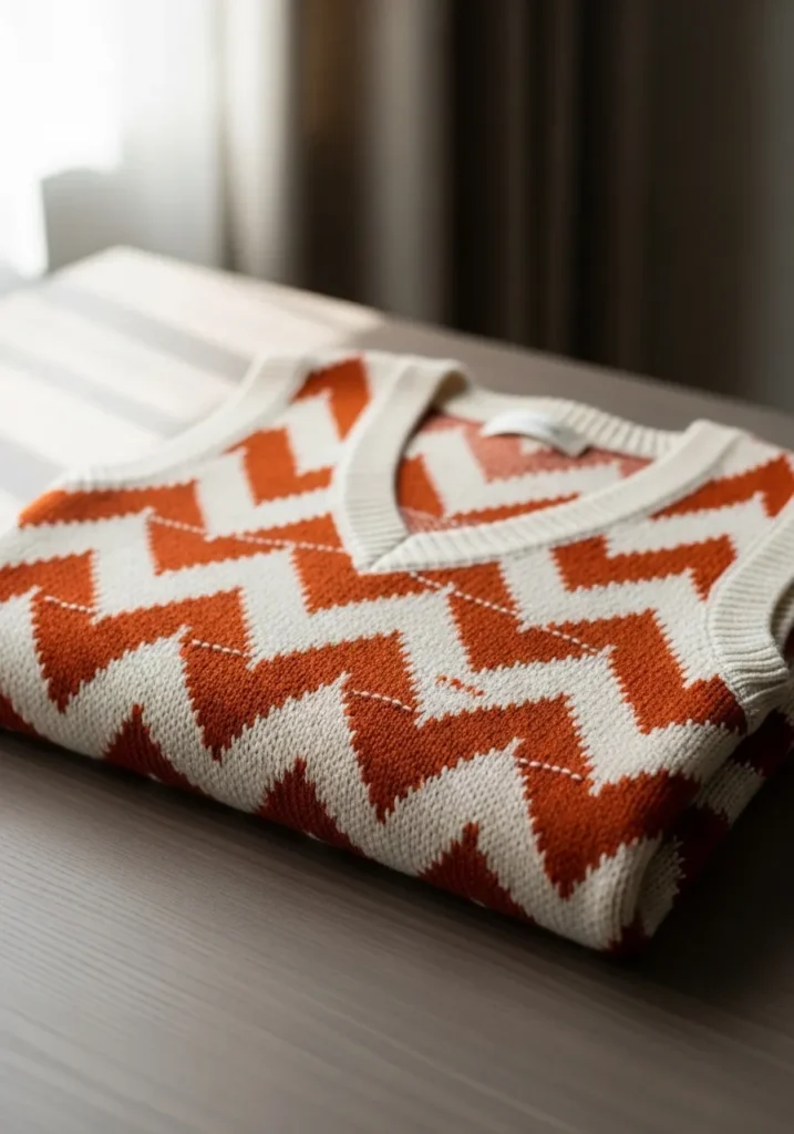This modern knitted vest features a bold chevron pattern in warm rust orange and crisp cream, creating a strong geometric look that feels both retro and current. The V neckline and ribbed trim add structure, while the smooth knit fabric keeps the design clean and polished. The sharp zigzag lines give it that eye catching statement vibe, yet the neutral base makes it surprisingly wearable.