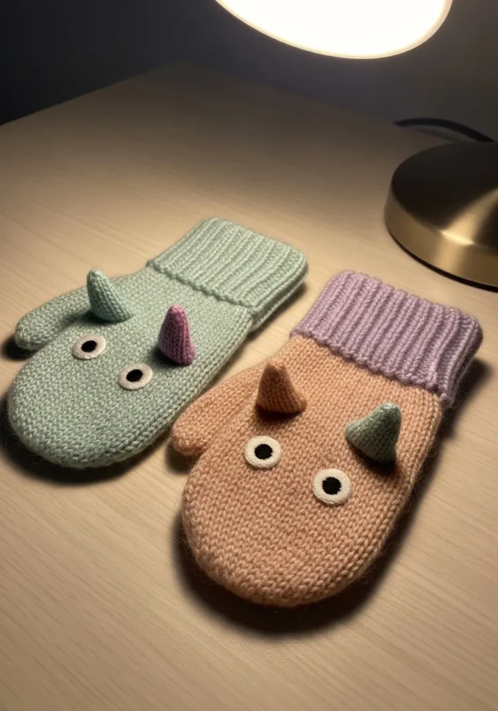 These knitted mittens combine soft pastel shades like mint, blush, and lavender with adorable three dimensional details such as tiny horns and stitched eyes. The smooth knit base keeps the design clean, while the whimsical facial features add personality. The overall look feels modern thanks to the soft color palette and minimal embellishments.