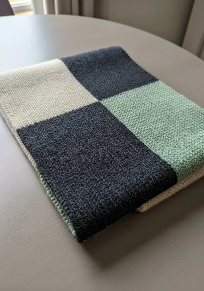 This modern knit scarf features clean color block sections in soft cream, charcoal gray, and muted sage green. The texture is smooth with visible stitch definition that adds a cozy, handmade feel without looking bulky. The colors feel calm and contemporary, and the simple rectangular shape keeps the focus on the bold blocks and subtle yarn texture.