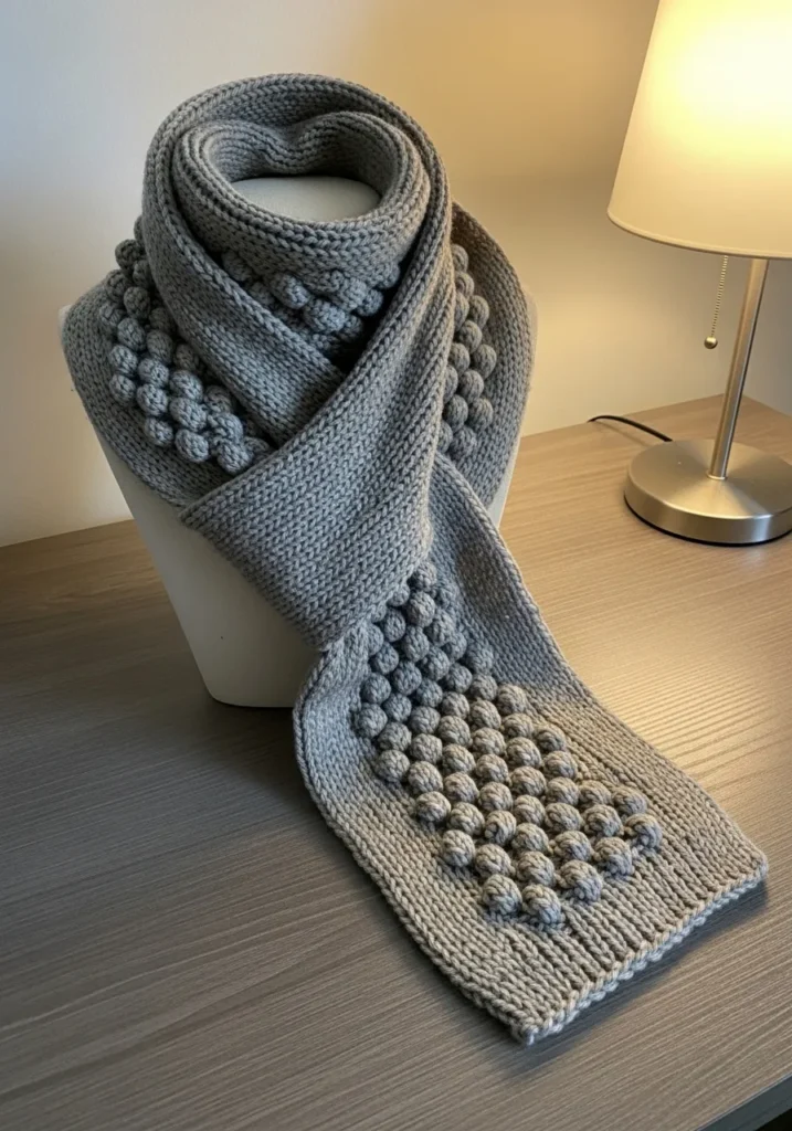 This modern knit scarf features a soft gray yarn with smooth sections paired with bold bobble texture panels. The fabric looks thick and cozy with clearly defined stitches that give it a plush and structured feel. The raised bobbles add depth and visual interest while the neutral color keeps the overall look clean and modern. It feels like a scarf that is meant to be noticed without being flashy.