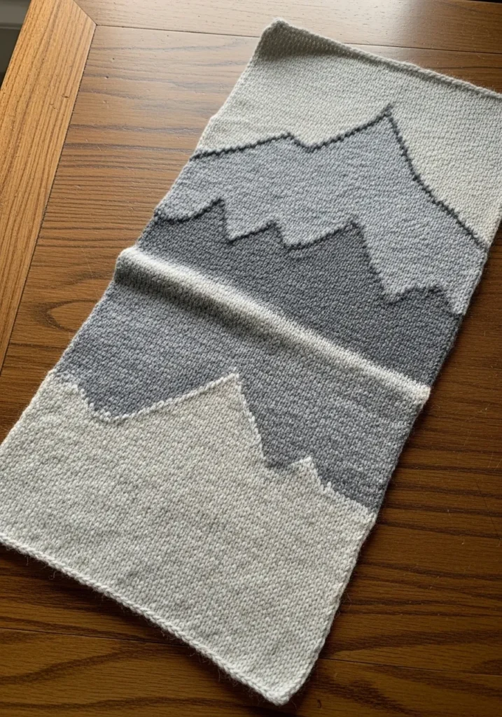 This modern knit scarf features a clean mountain inspired design in soft gray and off white tones. The sharp peaks are knit directly into the fabric, creating a subtle graphic pattern that feels calm and contemporary. The texture is smooth and even, with a slightly thicker feel that gives it structure while still draping nicely when worn.