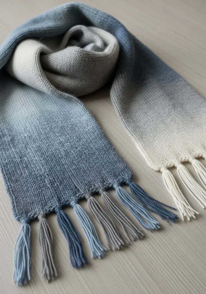 This modern knit scarf features a gentle ombre fade that shifts from deep blue into soft gray and creamy white. The texture looks smooth and cozy with an even stitch that lets the color transition really shine. Long fringe tassels finish each end and add movement while keeping the overall look light and relaxed. The color flow feels calm and modern without trying too hard.