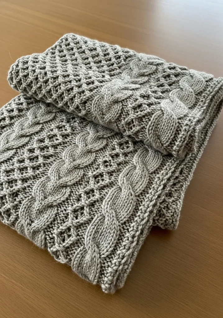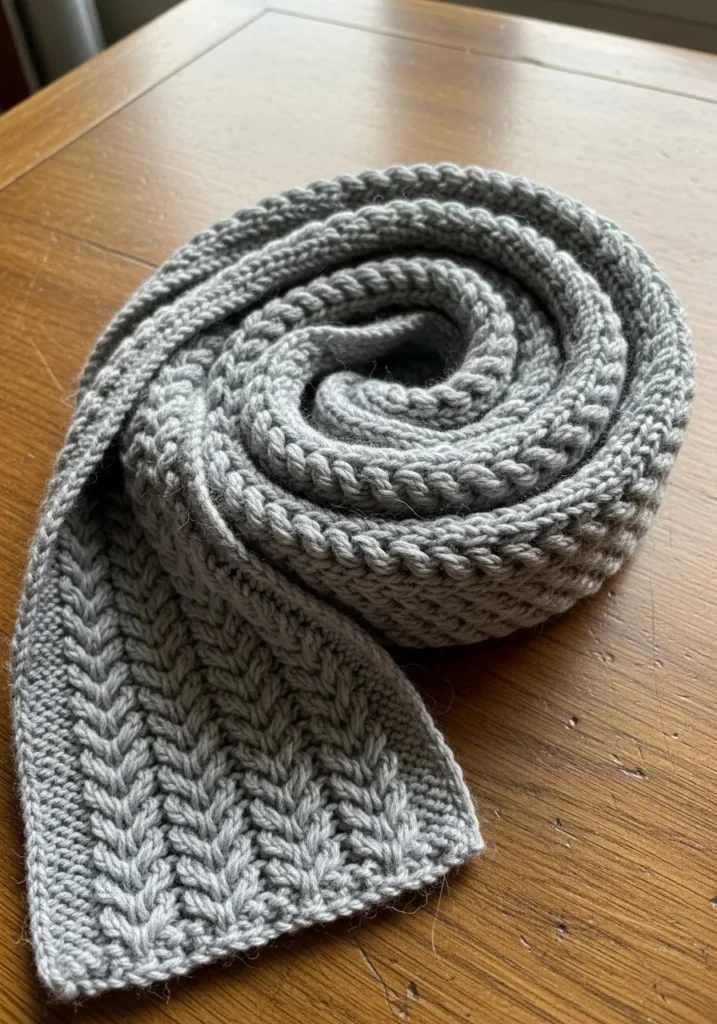 This modern knit scarf features a beautiful mix of ribbing and soft cable textures in a cool medium gray yarn. The stitches are bold and clearly defined, giving the scarf a cozy chunky feel without looking heavy. The alternating patterns add depth and interest, while the neutral color keeps it sleek and easy to style with almost anything.