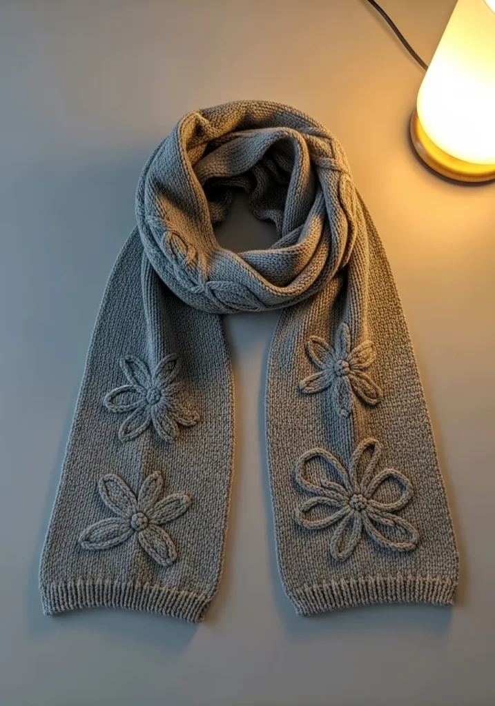 This modern knit scarf is made with a soft medium gray yarn and finished with raised floral appliqué details that add a gentle decorative touch. The base fabric has a smooth even texture that lets the flowers stand out without feeling busy. Each flower is knit in the same tone, giving the scarf a calm monochrome look that feels elegant and wearable while still being playful.