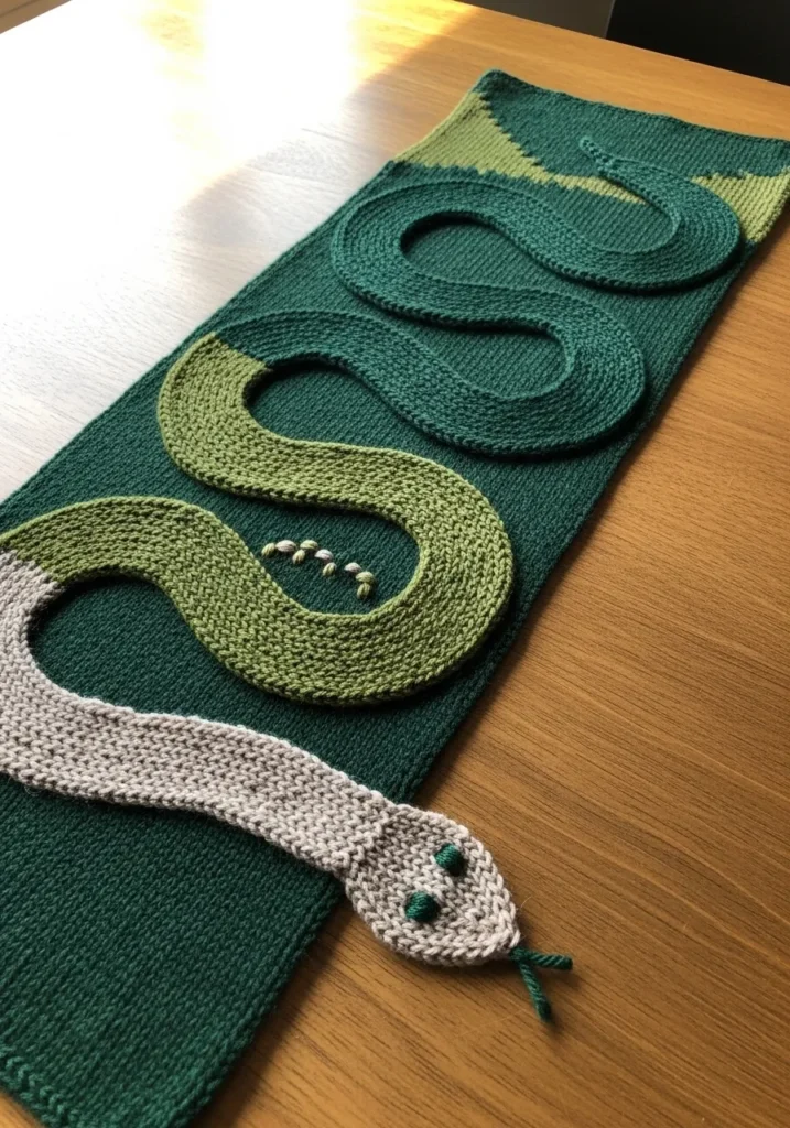 This modern knit scarf features a rich deep green base with a raised snake motif winding across the surface. The snake is knit in lighter green and soft gray tones, giving it a fun contrast while keeping the palette natural and calm. The texture mixes smooth flat knitting with thicker sculpted sections, which makes the design feel lively and slightly three dimensional without being bulky.