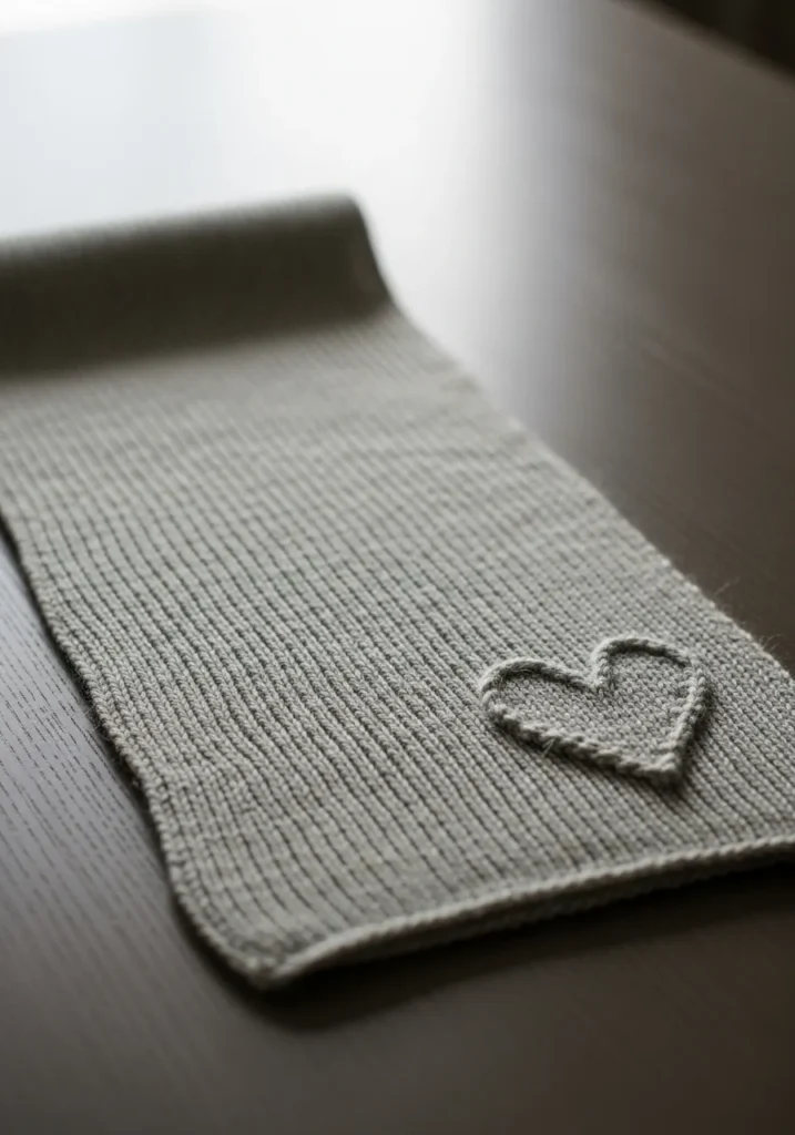 This modern knit scarf keeps things beautifully simple with a soft gray yarn and a clean ribbed texture that runs the full length. The fabric looks smooth and cozy with neat edges and a gentle drape. A small knitted heart sits near one end as a subtle raised detail, adding a sweet touch without taking away from the minimalist feel.