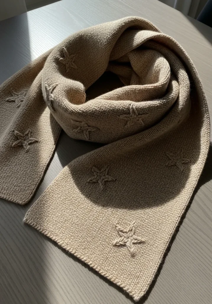 This modern knit scarf keeps things soft and understated with a warm beige yarn and tiny star stitch details scattered along the length. The texture is smooth and even, with the stars adding gentle dimension without overpowering the design. The neutral color gives it a calm modern feel, while the subtle stitched motifs make it quietly special and very wearable.