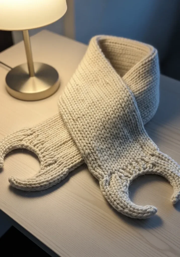 This modern knit scarf stands out with its sculptural looped ends that create a soft wrapped shape when worn. The chunky knit texture gives it a cozy feel, while the warm cream color keeps the look clean and contemporary. The yarn looks thick and plush with visible stitches that add depth and structure, and the integrated loops turn a simple scarf into something that feels thoughtfully designed.