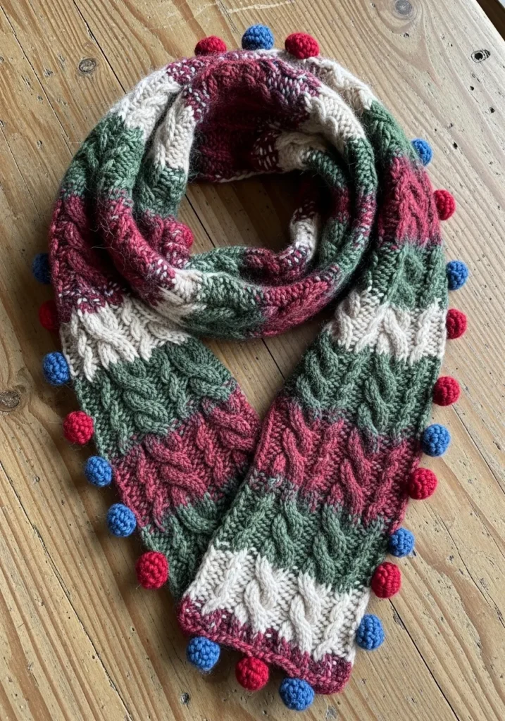 This modern knit scarf mixes chunky cable textures with cheerful pom details along the edges for a look that feels bold and full of personality. The yarn colors blend deep green, soft cream, rich red, and touches of blue, giving it a fresh twist on a classic palette. The raised cables add lots of cozy texture, while the little pom accents bring movement and a fun handmade vibe that instantly catches the eye.