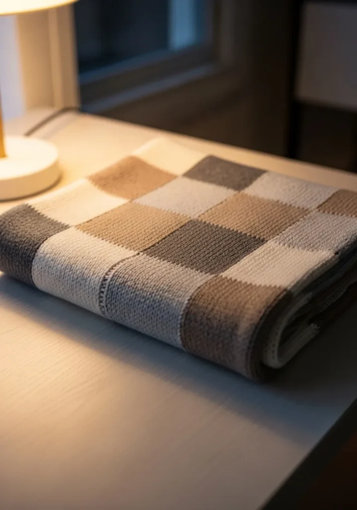 This modern knit scarf features a clean checker pattern in soft neutral shades like beige, taupe, cream, and light gray. The smooth knit texture keeps it cozy without feeling bulky, while the evenly sized squares give it a calm and balanced look. The muted color palette makes it feel timeless and modern, perfect for everyday outfits and easy layering.