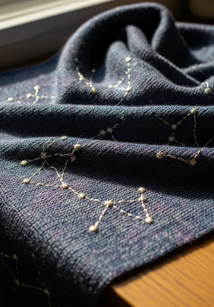 This modern knit scarf features a deep navy base with tiny stitched constellation patterns scattered across the surface. Fine metallic thread traces delicate star shapes that shimmer softly against the smooth knitted fabric. The texture stays lightweight and fluid, while the subtle sparkle adds a dreamy night sky feel without overpowering the design.
