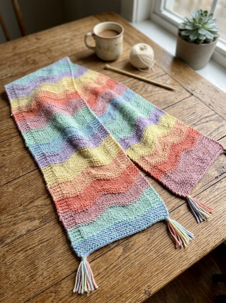 This dreamy scarf is knitted using a soft, pastel-toned yarn that transitions beautifully through shades of mint, lavender, peach, coral, butter yellow, and sky blue. The texture is a mix of stockinette and garter stitch sections arranged in a chevron-like wave pattern, giving it that gorgeous rippled look without being overly complicated to execute. The scarf finishes off with the cutest little multicolored tassels at each end, which honestly just ties the whole rainbow vibe together perfectly. It’s wide, cozy, and has that handmade charm that makes people stop and ask where you got it.