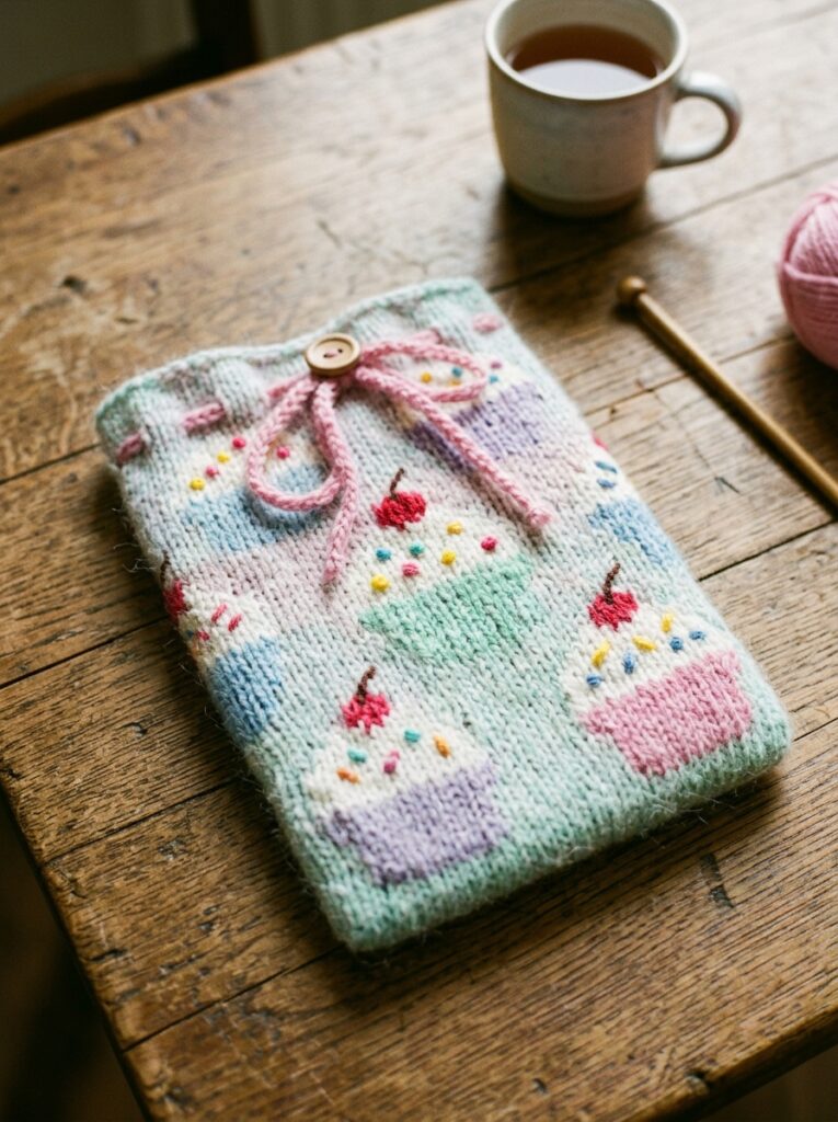 This book sleeve is so sweet and whimsical that it almost looks good enough to eat, and as a certified book lover I can confirm it is everything I never knew I needed in my reading life. It’s knitted in the most gorgeous soft pastel yarn that blends through shades of mint green, baby blue, lavender, and blush pink, creating a dreamy watercolor effect across the whole surface without you even having to do anything clever. Scattered across the fabric are the most adorable embroidered cupcake motifs complete with frosting swirls, tiny red cherries on top, and little rainbow sprinkle dots in yellow, red, and teal that add the most delightful pops of color. The sleeve closes with a pink braided tie threaded through the top and fastened around a sweet little wooden button, which is just the most perfect finishing detail.