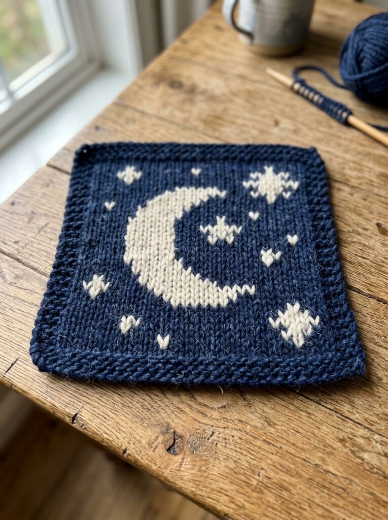 I love this project because it’s a perfect entry point for trying colorwork. The simple graphic of the moon and stars is less daunting than a complex fair isle pattern, and I think it’s a wonderfully creative way to add a bit of cozy style to a home, perhaps on a coffee table or as part of a larger, celestial-themed throw blanket. Since it uses straight needles, it’s definitely an easy pattern for any confident beginner to tackle, offering the satisfying experience of watching a sweet motif come together stitch by stitch.