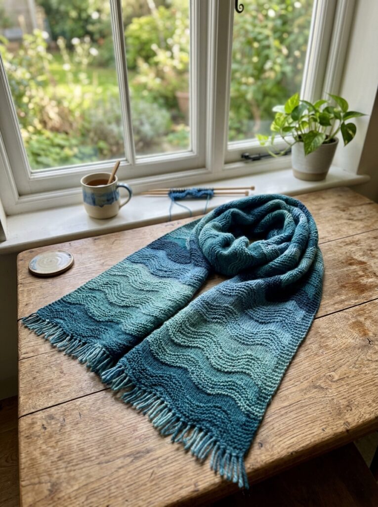 This stunning scarf looks like it was literally pulled straight from the sea, and I mean that in the best possible way. It’s worked in a gorgeous gradient yarn that flows from deep teal and navy through to soft sage and seafoam green, giving it that moody oceanic feel that is just so beautiful in person. The texture is where things get really interesting, because the pattern creates these flowing wavy lines across the fabric that mimic the look of gentle water ripples. It’s a wide, substantial scarf finished with delicate fringe along the ends, and the whole thing has a slightly relaxed, drapey quality that makes it look incredibly luxurious.