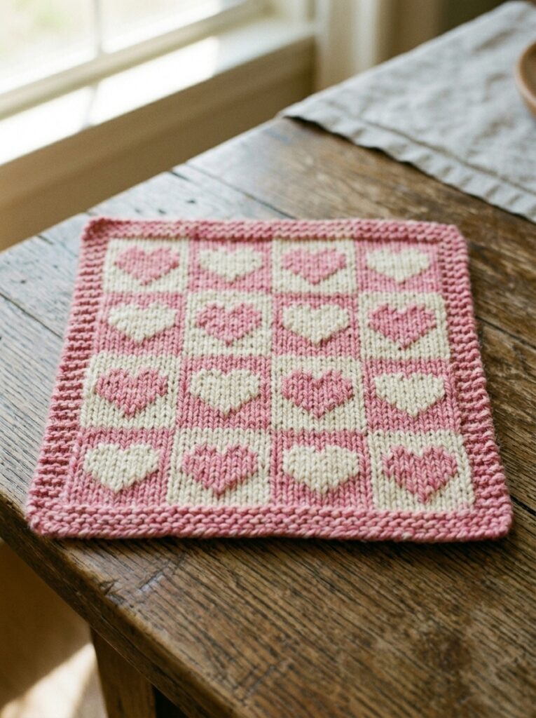 This dishcloth is so pretty that putting it anywhere near a dirty dish feels like a genuine crime, and yet here we are. It’s knitted in just two colors, a soft dusky pink and a warm cream white, using a stranded colorwork pattern that creates rows of alternating heart motifs across the whole surface in the most satisfying repeating grid layout. The hearts are nicely sized and really well defined against the contrasting background, so the pattern reads clearly and boldly without needing any complicated techniques to achieve it. The border is worked in a neat garter stitch frame in the same pink yarn that pulls everything together and gives the finished piece a really polished, almost quilt-like quality that makes it look way more fancy than a dishcloth has any right to be.