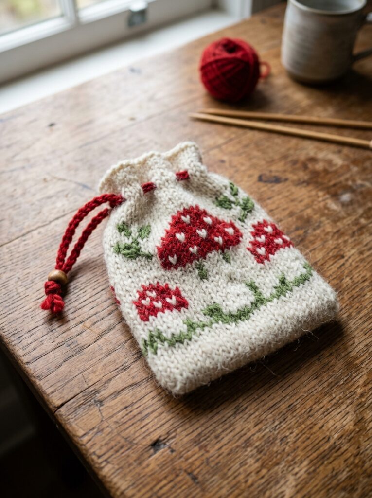 This little pouch is possibly the most adorable thing I have ever seen in knitted form, and I am not even slightly exaggerating. It’s worked in a soft, creamy off-white yarn as the base, with a charming fair isle style motif featuring red and white spotted mushrooms and little green trailing vines running across the fabric. The texture is a classic stockinette knit that gives it a smooth, neat finish, and the whole bag is topped off with a braided red drawstring threaded through with a small wooden bead. It’s compact, cute, and has that cozy cottagecore aesthetic that is absolutely everywhere right now for very good reason.