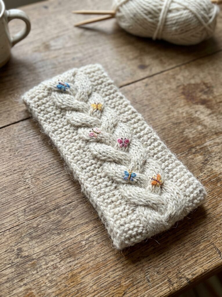 I find this project so exciting because it’s basically two crafts in one, and that feels like getting the best of both worlds. You knit the headband first using a straightforward cable pattern which is very manageable on straight needles, and then once it’s done you get to sit down with your embroidery thread and add those sweet little butterflies at your own pace. The embroidery part is honestly so relaxing and meditative, and you can make each butterfly slightly different which keeps things really fun. It’s a small project that knits up quickly, and the finished result looks so detailed and special that people will genuinely be amazed when you tell them you made it yourself.