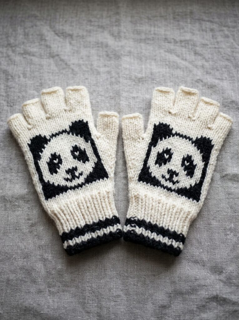 These fingerless gloves are so ridiculously cute that I genuinely had to stop and just appreciate them for a moment before even thinking about writing anything. They are knitted in a crisp cream white yarn with bold black colorwork creating an adorable panda face right across the palm of each glove, complete with those classic round panda eye patches, a little nose, and the sweetest expression that honestly looks like it’s smiling at you. The cuffs feature a neat ribbed band with black and white stripes that ties the whole design together really nicely, and the fingerless style means they are completely practical for everyday wear while still being the most personality-packed accessory in the room.