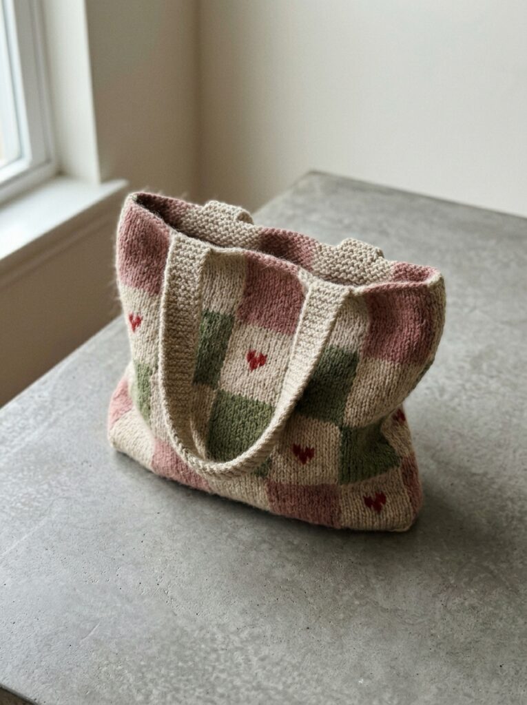 This tote bag is the kind of thing that makes people stop you on the street to ask where you bought it, and the look on their face when you say you made it yourself is absolutely priceless. It’s knitted in a soft, chunky yarn using a dreamy color palette of cream, dusty pink, and sage green arranged in a large checkerboard pattern, with the most adorable tiny red hearts dotted throughout that add just the right amount of sweetness to the design. The texture is a dense, sturdy garter stitch that gives the bag real structure and body so it actually holds its shape beautifully when you carry it. The handles are knitted in the same cream yarn and look perfectly proportioned against the roomy square shaped body of the bag.