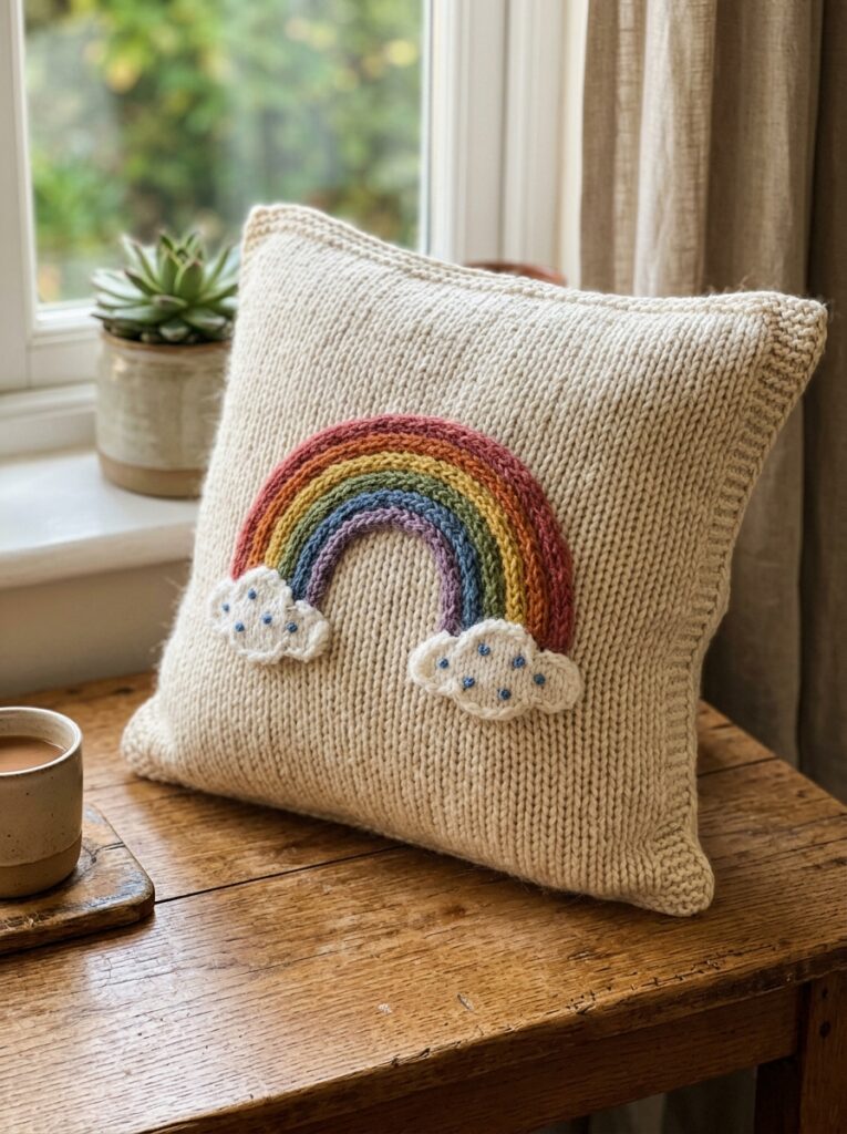 This cushion cover is the coziest, most cheerful thing you could possibly add to your sofa or window seat, and I am genuinely in love with every single detail of it. The base is knitted in a chunky, warm cream yarn using a simple garter stitch that gives it a beautifully thick and squishy texture, and then the real magic happens with the appliqué rainbow decoration stitched onto the front. The rainbow is made up of individual knitted arches in muted, earthy tones of rose pink, burnt orange, mustard yellow, sage green, dusty blue, and soft lavender, giving it that grown up boho feel rather than anything too primary or garish. Two little fluffy white cloud appliqués sit at the base of the rainbow, each dotted with tiny blue embroidered spots that are almost too cute to handle.