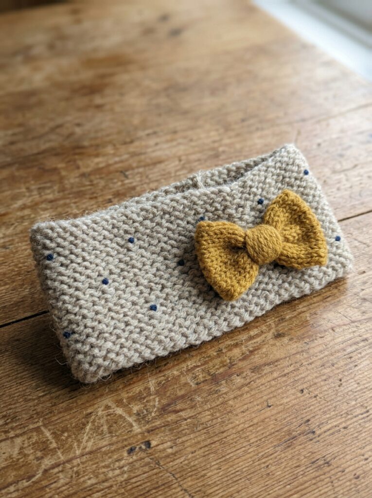 This little headband is the definition of understated charm and I think it might be one of the prettiest quick knits I have come across in a long time. It’s worked in a lovely oatmeal beige yarn that has the most subtle navy speckle running through it, giving it that artisan hand-dyed quality that looks so expensive and considered. The stitch pattern is a classic seed or moss stitch which creates a beautifully even, slightly bumpy texture across the whole band, and then the showstopper detail is the chunky mustard yellow knitted bow attached right at the front. That pop of golden mustard against the neutral speckled base is just such a perfect colour combination and feels very autumn wardrobe ready in the best possible way.
