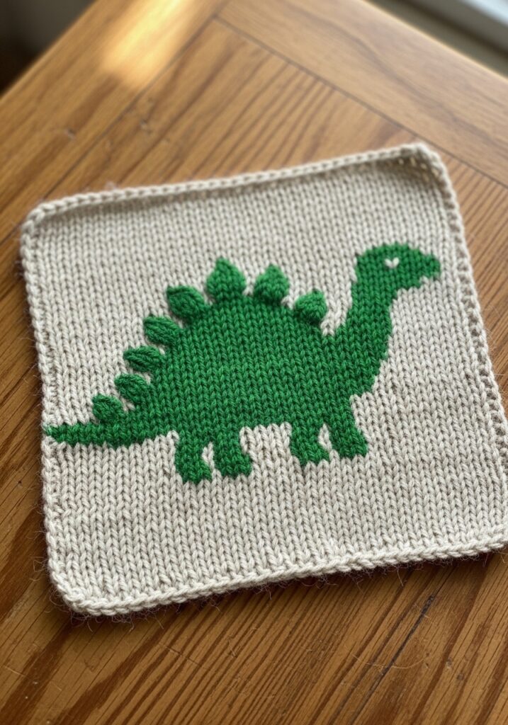 I think this motif is an absolute gift for anyone who knits for kids, because literally every child goes through a dinosaur phase and this square is cool enough to keep parents happy too. The two color stranded technique sounds intimidating but a stegosaurus silhouette is actually a really forgiving shape to work with since the color changes follow a clear and logical outline. It would look incredible as part of a prehistoric themed baby blanket with a whole herd of different dinosaurs, or as a panel on a child’s knitted sweater or backpack. I have seen this kind of motif used as a framed nursery print too, and honestly that is such a sweet idea for a handmade baby gift that costs next to nothing but looks completely thoughtful and special.