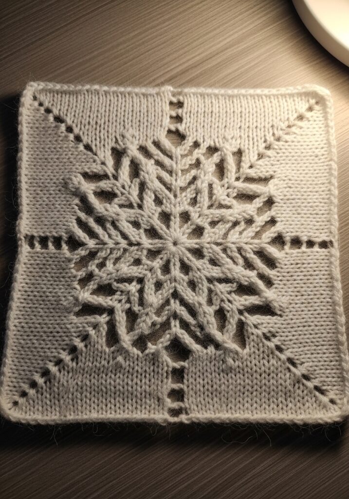 I will be honest with you, lace knitting has a reputation for being scary and fiddly, but a structured snowflake motif like this is actually one of the more logical lace patterns to follow because the symmetry of the design means each section mirrors the last. Once you have worked through one arm of the snowflake the rest clicks into place really naturally. I think this square would be absolutely stunning blocked out flat and framed as winter wall art, or joined with other squares into the most elegant Christmas table runner. It also makes a really beautiful coaster or mug rug for the holiday season, and knitting several of these in a row while watching a festive film is honestly one of my favourite winter evening activities.
