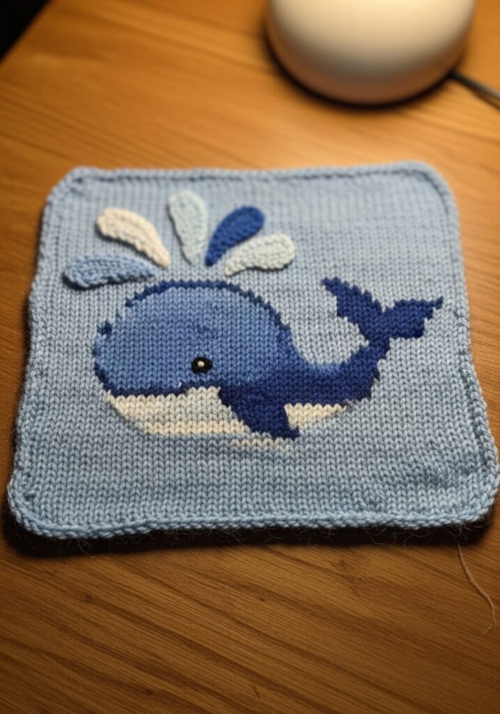 I love this motif because it layers a few different techniques together in a way that feels really achievable and genuinely fun. The colorwork body keeps you engaged without being overwhelming, and adding the little raised spout at the end feels like the most satisfying finishing moment of the whole project. This square would be absolutely gorgeous as part of an ocean themed baby blanket alongside other sea creatures, or as a single panel on a knitted nursery cushion. It also makes a really sweet gift bag for a new baby present, and honestly once you make one you will immediately start planning a whole underwater collection to go with it.