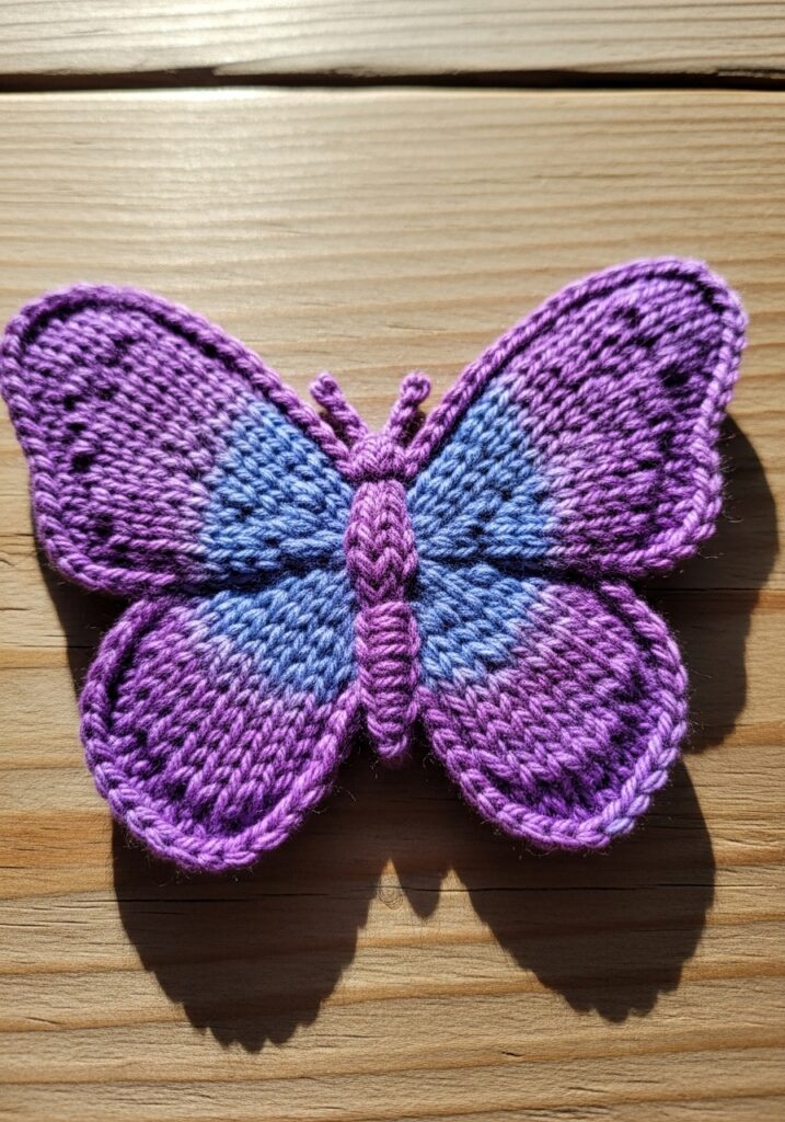 This stunning butterfly motif is giving all the cottagecore fairy garden vibes, and I am absolutely here for it. The wings are worked in a beautiful combination of violet purple and soft periwinkle blue, with the two tones blending together across the wing panels in the most naturally pretty way. The upper wings are slightly darker and feature tiny decorative eyelets that mimic the delicate spotted markings you’d see on a real butterfly, while the lower wings are fuller and rounder with that gorgeous smooth stockinette texture. A neat ridged body runs down the center with two sweet little curling antennae at the top, and the whole outline is finished with a raised border that really makes this piece look polished and three dimensional. It’s knitted in a smooth DK weight yarn that captures every stitch definition beautifully.
