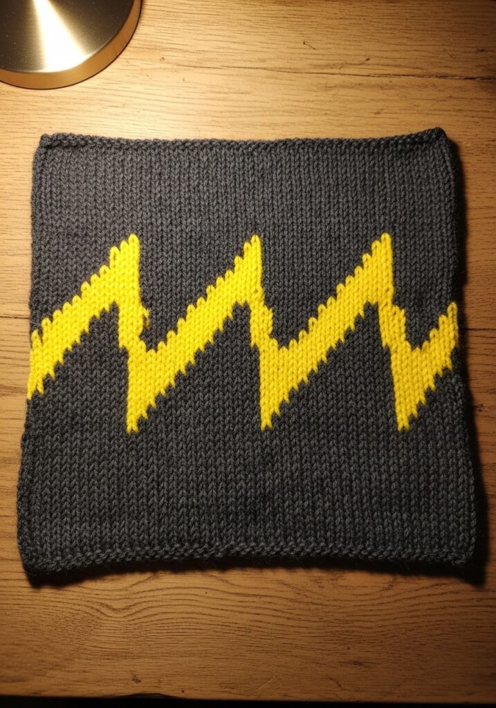 This lightning bolt square is edgy, graphic, and just a little bit rock and roll, and I am absolutely obsessed with how cool it looks. The background is worked in a dark charcoal grey worsted weight yarn that gives the whole piece a moody and dramatic feel, and three bold jagged lightning bolt shapes are worked across the center in the most electric neon yellow you can imagine. The bolts are created through stranded colorwork and each one has that classic sharp zigzag silhouette with pointed tips and angular edges that make the whole design feel energetic and dynamic, almost like you can feel the electricity crackling off it. The yellow against the dark grey is such a powerful contrast that the bolts genuinely appear to glow, and the smooth stockinette surface lets every stitch catch the light in a way that makes the colors look even more vivid. The whole square has a clean rectangular shape with a simple garter border that keeps the focus entirely on that striking central motif.