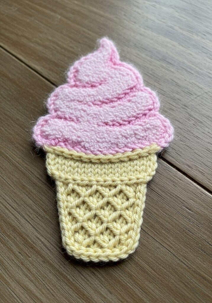This ice cream cone motif is peak summer cuteness and I genuinely cannot decide if I want to knit it or eat it, which I think means it is a complete success. The cone section is worked in a soft warm cream yarn using a diagonal lattice stitch pattern that captures the crosshatch texture of a real waffle cone so perfectly it is almost uncanny, with each little diamond puffy and well defined thanks to the smooth cotton blend yarn used throughout. The cone shape tapers naturally to a rounded base and sits in lovely proportion to the generous swirl of ice cream above it. That swirl is the real star of the show, worked in the most delicate dusty pink that builds up in soft rounded layers mimicking that classic soft serve twist, with a raised outline running around the edge of each section that gives the whole thing beautiful dimension and movement. The overall silhouette is instantly recognizable and just incredibly charming from every angle.
