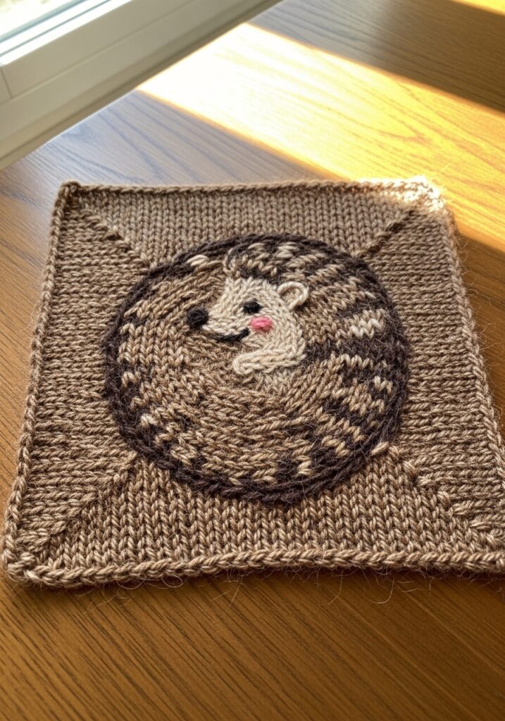 This little hedgehog square might just be the most heartwarming thing I have knitted all year, and I am not even slightly embarrassed about how much I love it. The background is worked in a warm tawny brown DK weight yarn with a subtle heathered texture that gives the whole piece a lovely natural woodland feel, and a large circular hedgehog shape sits right at the center, knitted as a raised appliqué in a deeper chocolate brown that really stands out beautifully against the lighter background. The hedgehog is shown in that classic curled up sleeping position, its round spiny body filling almost the entire circle, and the spine texture across the back is suggested through clever stitch work and tonal contrast that looks impressively realistic without being fiddly or complicated. The little face peeks out from one side with the most precious expression, featuring a cream and pale grey muzzle area, tiny black embroidered eyes, and the most adorable little pink embroidered nose that is so small and perfect it genuinely makes you want to squeal. A dark outline stitch running around the entire circular shape lifts it away from the background and gives it a wonderfully polished storybook illustration quality.