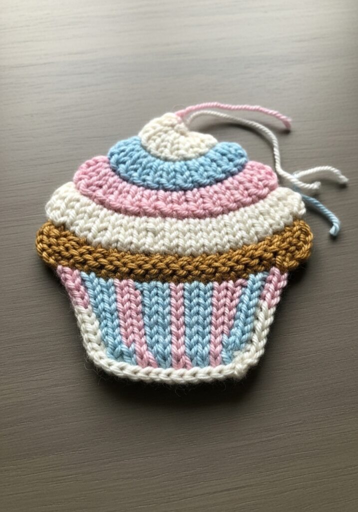 If there was ever a knitted motif that made you want to grab a real cupcake from the kitchen, this is absolutely it. This scrumptious little piece is worked in a smooth DK weight yarn across several pastel shades, and the attention to detail is what really makes it shine. The cupcake case is knitted in soft blue, pink, and white vertical stripes that perfectly mimic those classic paper cupcake liners, and a warm golden brown ridge of twisted stitches sits across the top of the case like a little crimped wrapper edge. The frosting section above is worked in swirling layers of cream, pink, and blue, building up in gentle rounds to suggest that swooped buttercream look we all know and love. Right at the very top sits a small round cream-colored cherry detail that is just the most precious finishing touch imaginable.