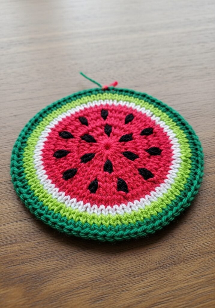 This round watermelon motif is basically summer captured in yarn form, and it is making me ridiculously happy just looking at it. Knitted in the round from the center outward, the piece starts with a bold and juicy hot pink center worked in smooth cotton yarn, dotted all over with black embroidered seed shapes that are so realistically placed it almost looks good enough to eat. Moving outward from the pink flesh, there is a crisp white ring followed by a bright lime green band, and then a final deep forest green outer border that completes the rind effect perfectly. The whole thing sits as a flat, neat circle with a lovely even tension throughout, and the color transitions between each ring are clean and sharp, which gives the whole motif that satisfying almost graphic quality.