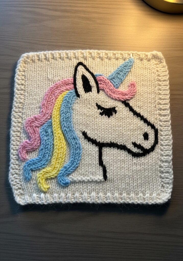 This unicorn square is the kind of motif that makes you feel like a proper knitting artist when it is finished, and I mean that in the best possible way. The background is worked in a clean soft cream yarn with a neat garter stitch border framing the whole piece, giving it a tidy and polished look. The unicorn face and neck are outlined and detailed entirely through black embroidery stitching worked over the stockinette background, capturing the most elegant little side profile with dreamy closed lashes and a delicate nostril. A pastel rainbow mane flows dramatically to the left in loose dimensional yarn strands of pink, yellow, and blue that are actually stitched and looped on top of the knitted surface to create gorgeous texture and movement. The horn rises up in a soft blue shade with a gentle twist of pink, giving the whole piece that unmistakably magical quality that unicorn fans of all ages will absolutely swoon over.
