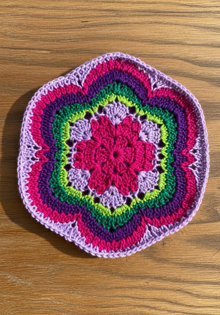 This circular mandala motif is an absolute explosion of color in the best possible way, and every single time I look at it I spot something new to love about it. Starting from a tight hot pink flower center, the design blooms outward in concentric rounds through the most joyful combination of colors including deep magenta, soft lilac, lime green, rich emerald, dark purple, and a bright pink, all finished with a soft lavender scalloped outer edge that gives the whole piece its gorgeous petal-like silhouette. Each round introduces a new stitch texture, from tight clustered petals at the center to more open lacy fan shapes in the middle rounds, creating a really beautiful layered effect that looks incredibly intricate up close. The yarn is a smooth DK weight that gives every stitch beautiful definition, and the overall piece has a slightly domed quality from all those stacked rounds that makes it feel wonderfully substantial in your hands.