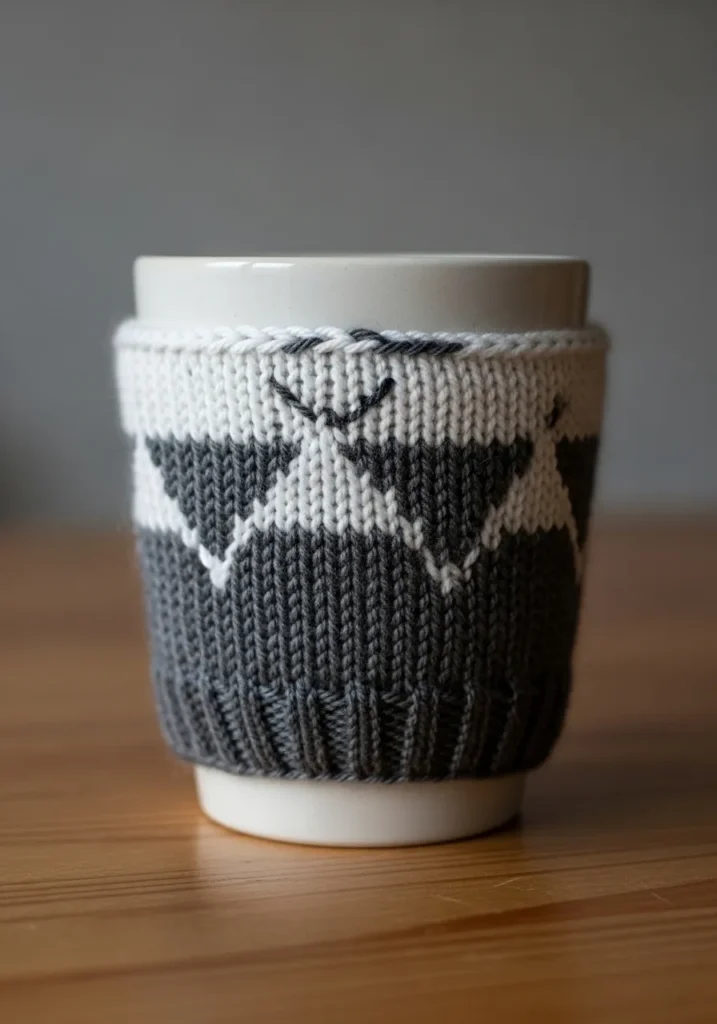 This stylish knit coffee cozy wraps snugly around a simple white mug and instantly gives it a modern twist. It is worked in soft gray and creamy white yarn with a bold geometric pattern that feels clean and graphic. The lower section features a ribbed texture for stretch and grip, while the upper section shows off neat colorwork triangles that create a subtle mountain inspired design. The stitches look tidy yet softly textured, giving it that warm handmade charm without feeling bulky.