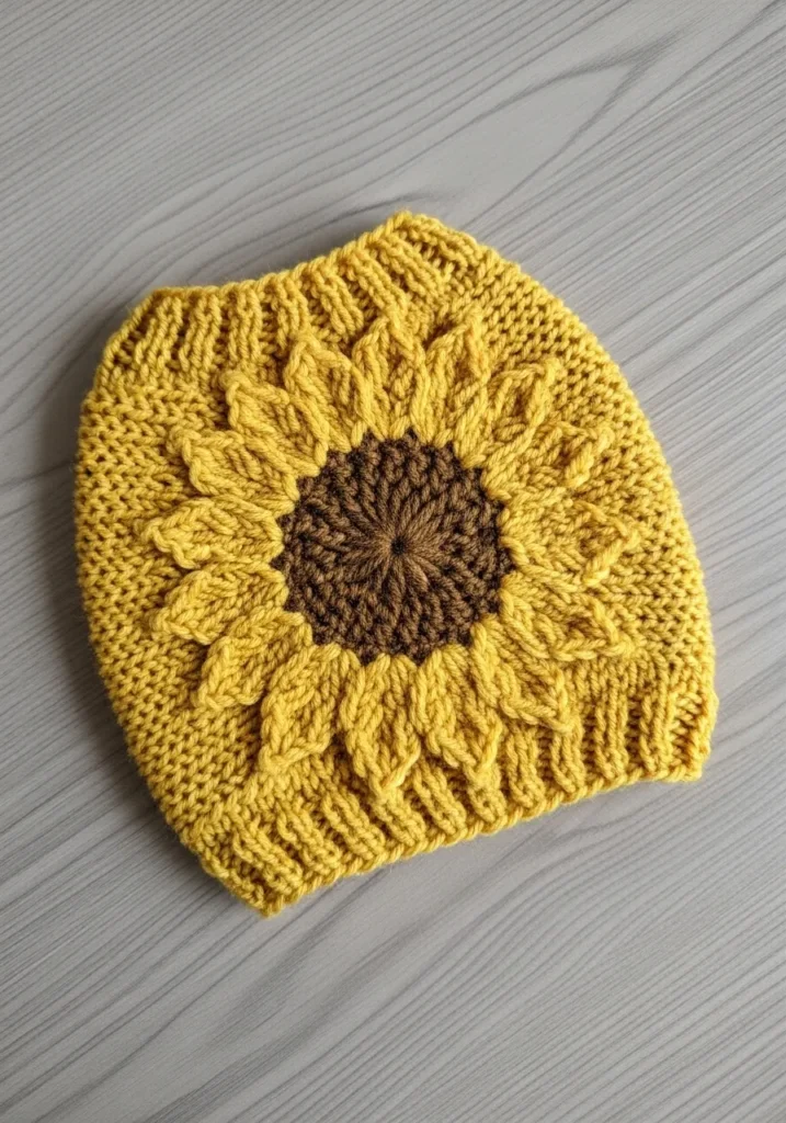 This eye catching knit beanie is designed to look like a blooming sunflower, and it is such a happy little statement piece. The base is worked in a warm golden yellow yarn with a ribbed brim that hugs the head comfortably. At the center sits a rich brown circle that mimics the sunflower seeds, surrounded by textured petal stitches that fan out beautifully across the hat. The raised petals add depth and dimension, giving the beanie a playful 3D effect while still keeping it soft and cozy.