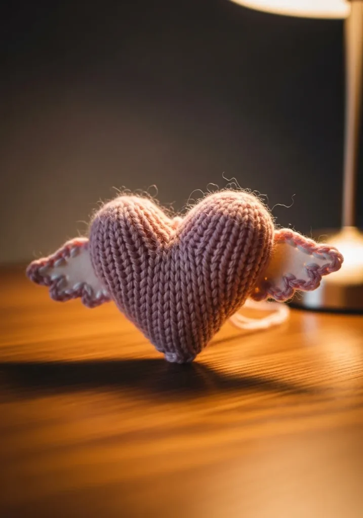 This darling knit heart ornament is worked in a soft blush pink yarn that looks plush and gently textured. The heart shape is slightly rounded and lightly stuffed, giving it a cozy, pillowy feel. On each side, delicate little wings in creamy white yarn add a whimsical touch that makes it look almost storybook inspired. The stitches are neat but still have that lovely handmade softness, and the overall design feels romantic and charming without being over the top.