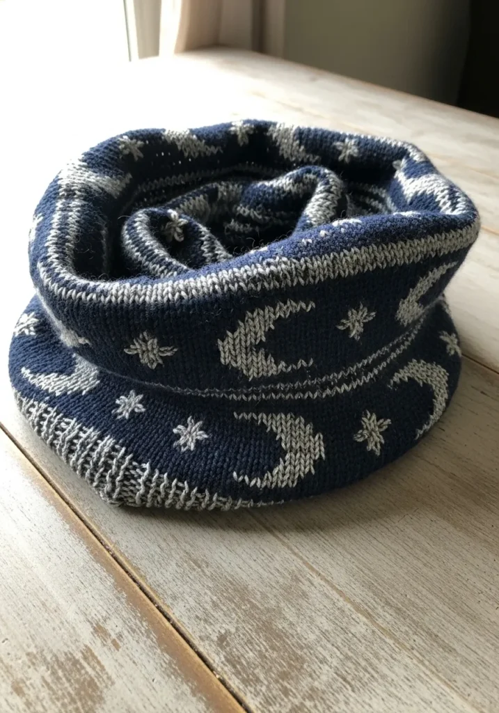 This dreamy knit cowl is worked in a deep navy yarn that instantly feels cozy and elegant. Wrapped around the fabric are soft gray moon and star motifs that create a gentle night sky pattern all the way around. The stitches look smooth and even, with a slightly stretchy texture that helps the cowl sit comfortably when looped. The edge has a subtle ribbed finish that frames the design and keeps everything looking polished yet still warmly handmade.